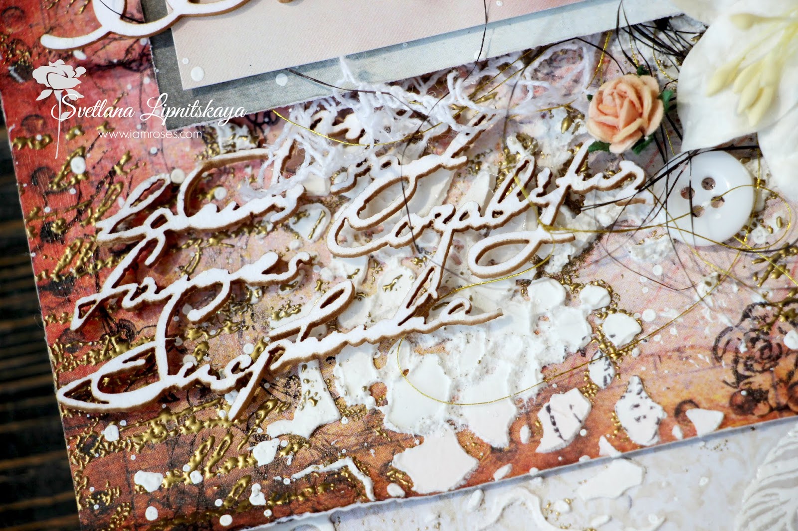 Итак, бумага из разных коллекций 7Dots, шикарные цветы IAR, обожаемый чипборд ScrapBox, отштамповка листиков Lesya Zgarda. А золотые брызги и эмбоссинг текстового штампа - это пудра Золотое зеркало Фабрики Декору, которую я очень люблю.